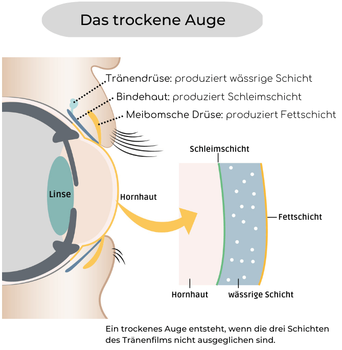 A deficiency of vitamin A can also lead to dryness of the conjunctiva. In addition, tobacco smoke, car exhaust fumes, air conditioning, drafts, older age, diseases such as conjunctivitis, diabetes, thyroid disorders, autoimmune diseases, rheumatism, Sjögren’s syndrome and dry indoor air can be causes of dry eyes.